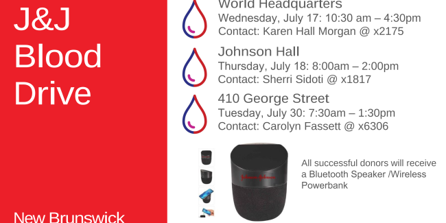 Did you know that a one-time blood donation can help save up to three lives? Help save a life (or many) at Johnson & Johnson’s first Summer Blood Drive, to be held on three separate days this month: July 17, 18 and 30.
