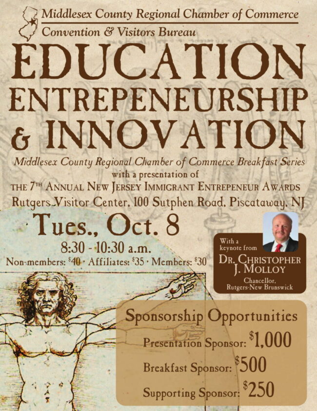 You won’t want to miss the first event of the Chamber’s Breakfast Series: “Education, Entrepreneurship and Innovation” on Tuesday, Oct. 8 at the Rutgers University Visitors Center, at 100 Sutphen Road…