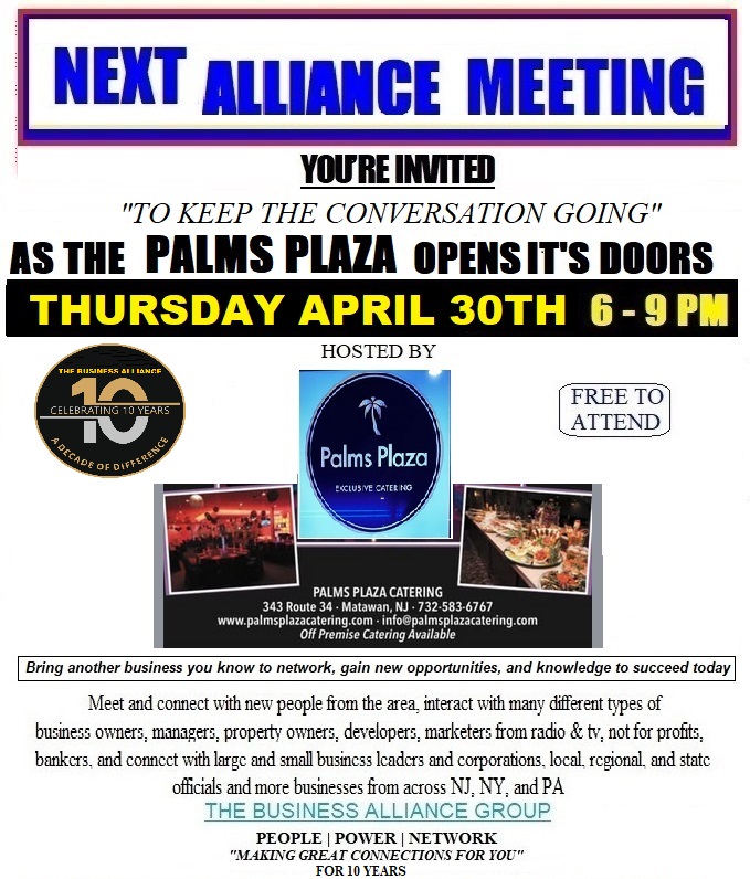 - Upcoming Program – April “Keep the Conversation Going” Business Alliance Meeting: Join the Business Alliance Group on April 30, 6-9 PM at the Palms Plaza in Matawan…Click Here For Details